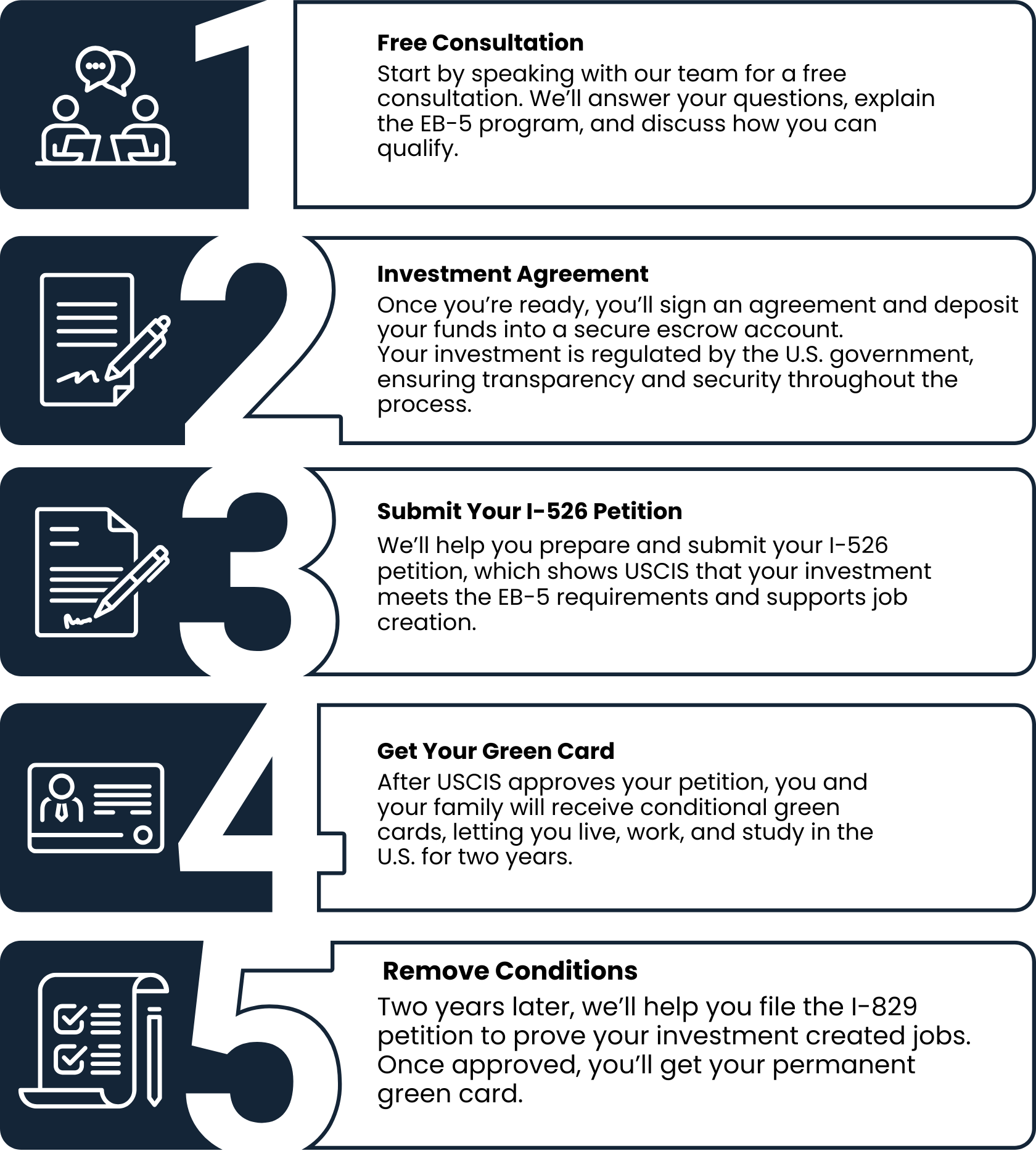 Begin with a free consultation to understand the EB-5 program. Secure your investment with a government-regulated escrow account.